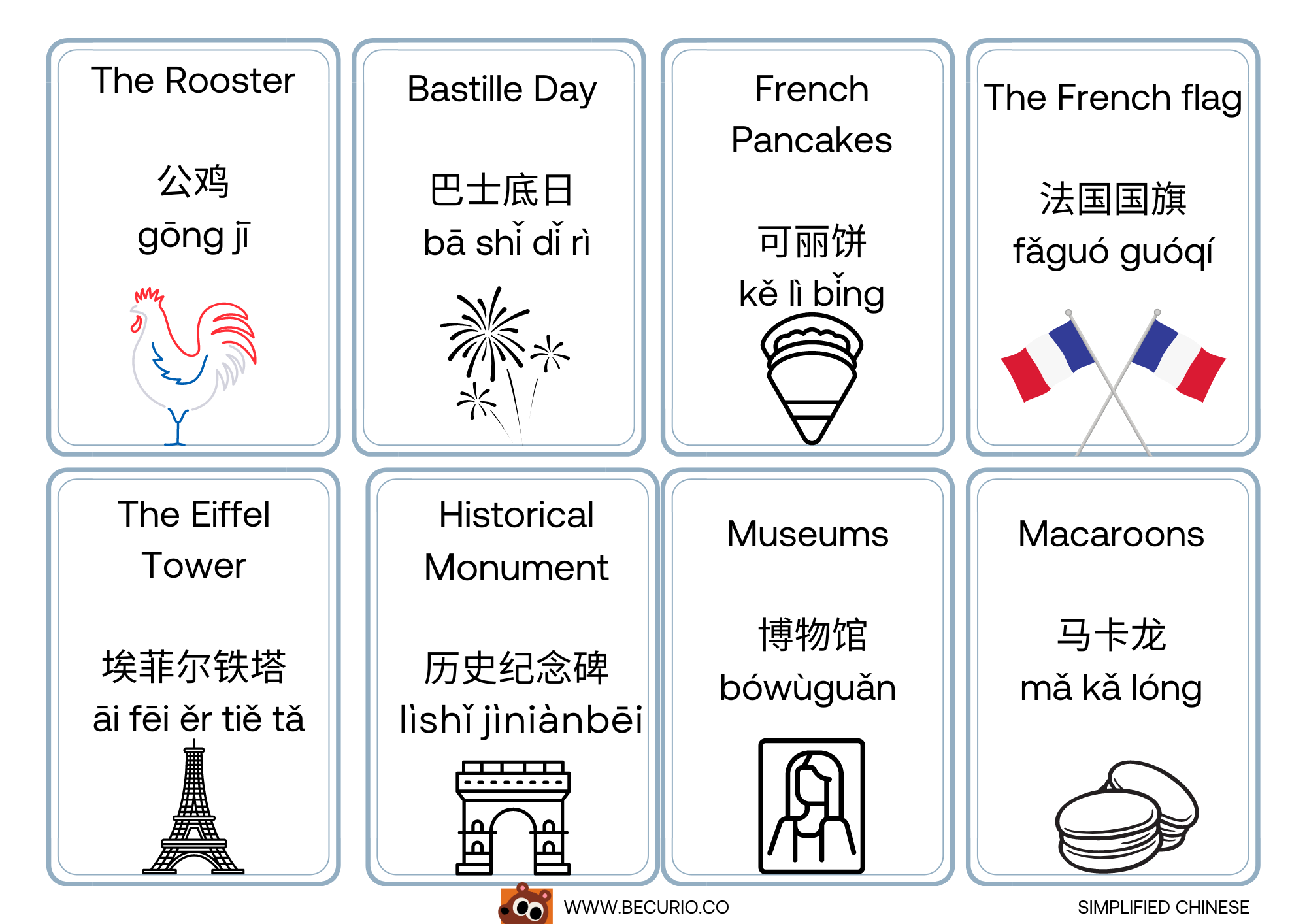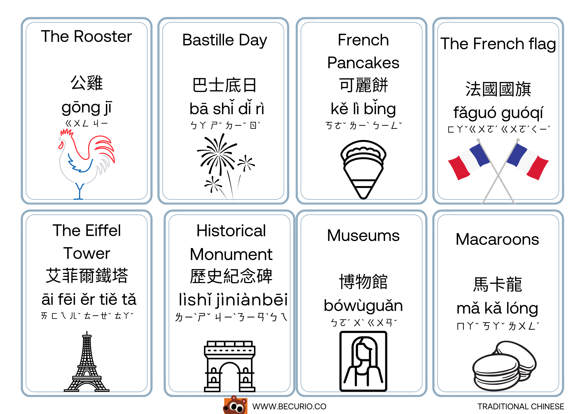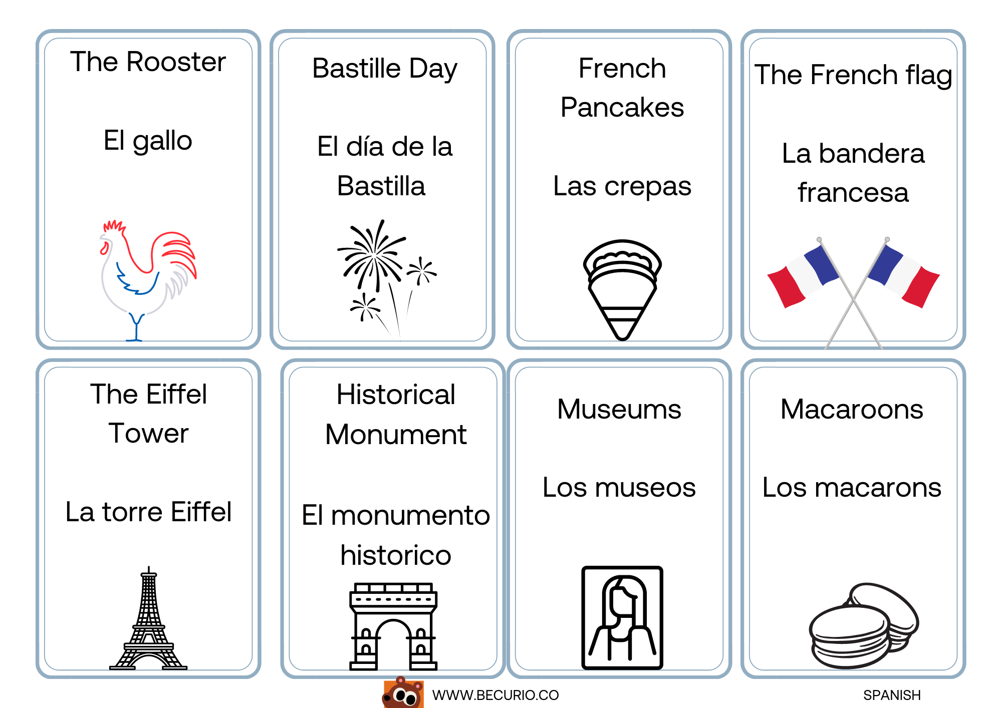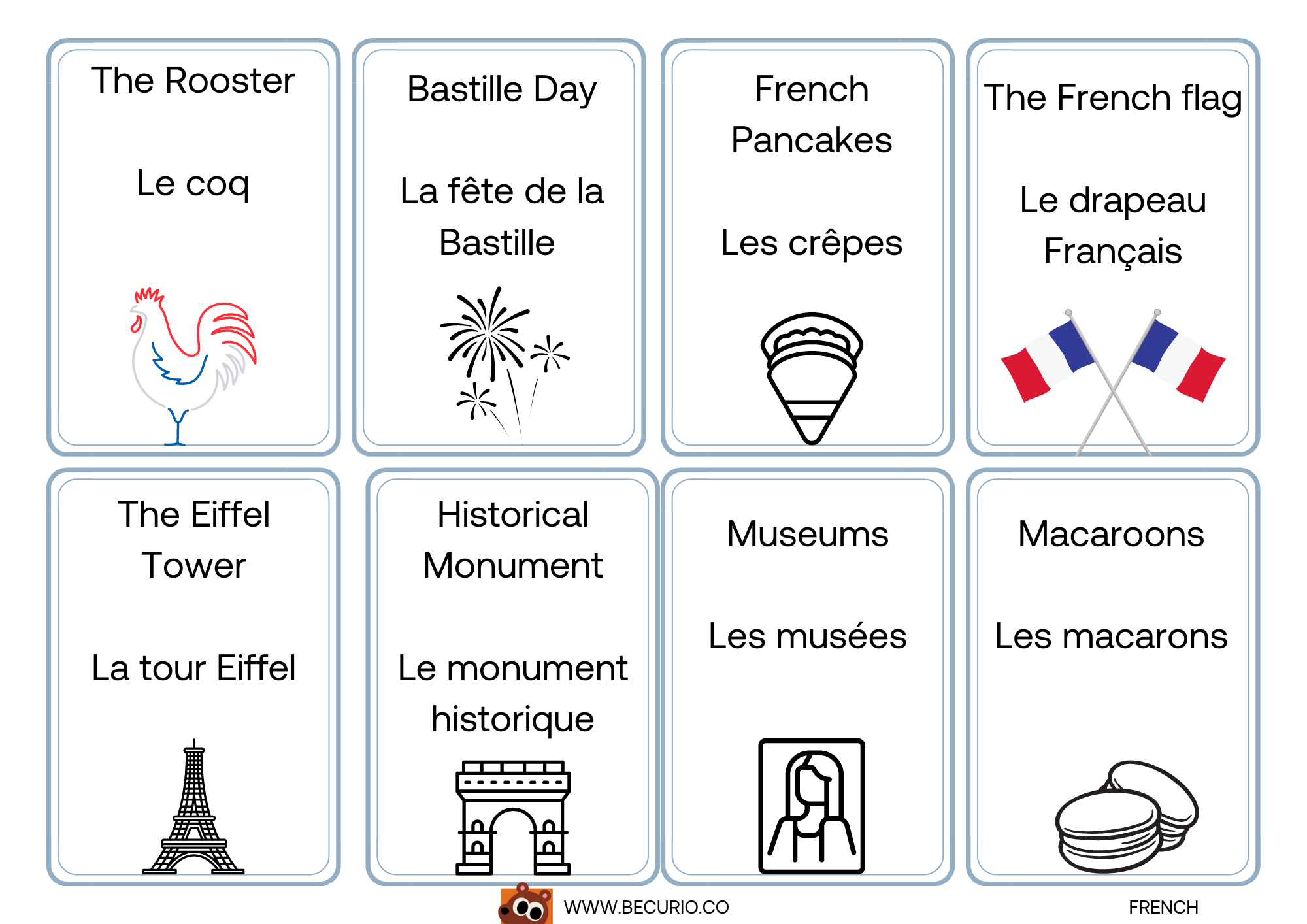 Last week, on July 14th was Bastille Day. In honor of Curio's upcoming French book subscription box, this week's language flashcards showcase some iconic words of French culture.