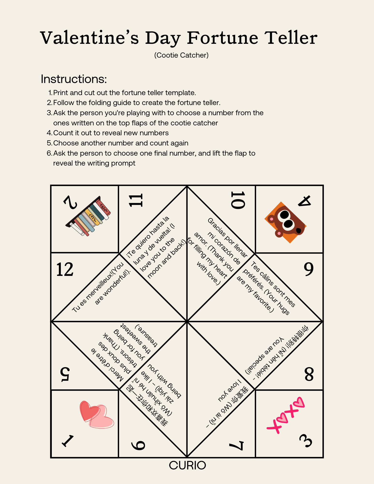 A playful fortune teller filled with sweet actions in Spanish, French, and Chinese—perfect for a festive twist on language fun.
