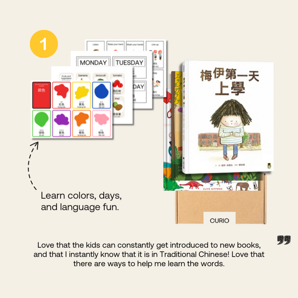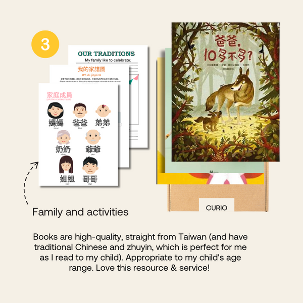 - A unique selection of 3 picture books in Chinese (Some books have bopomofo, depending on the publishers)